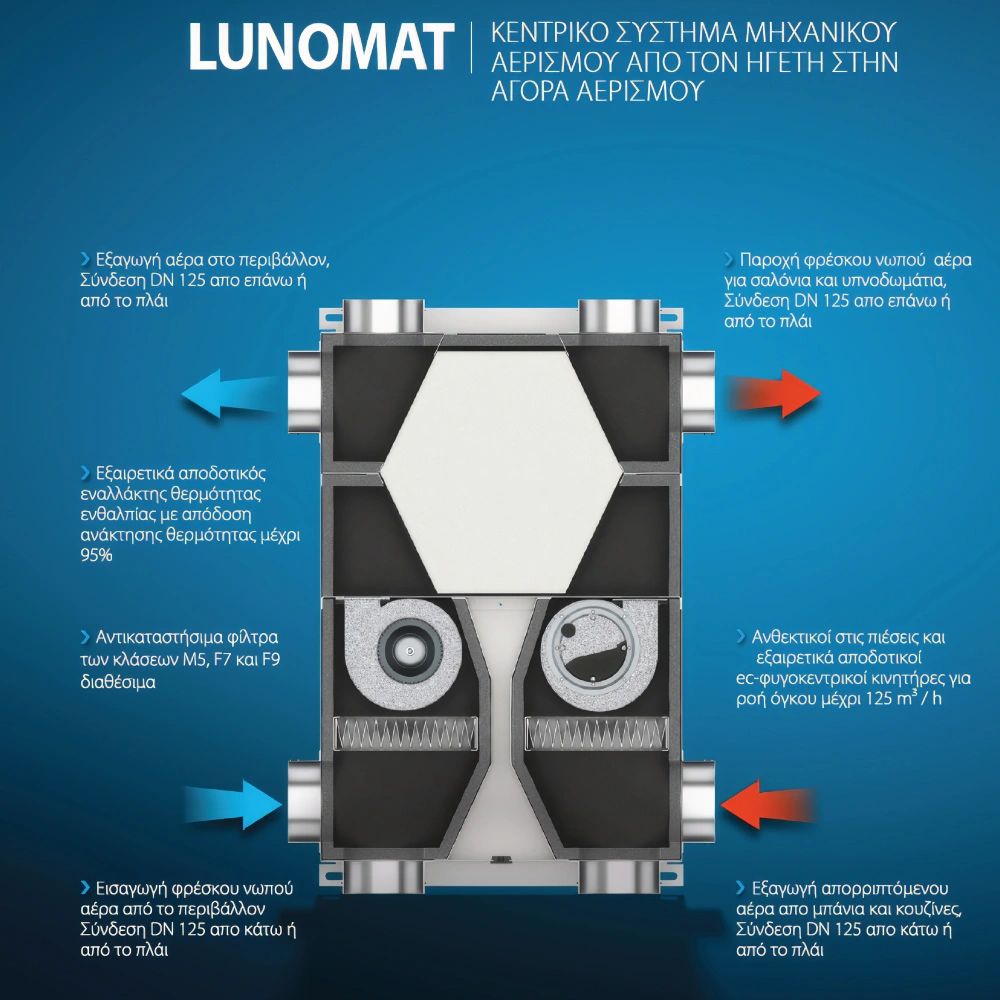 Το σύστημα LUNOMAT εισάγει φρέσκο αέρα στο εσωτερικό του κτιρίου και απομακρύνει τον αέρα εξαγωγής (αέρα που έχει χρησιμοποιηθεί) από τους εσωτερικούς χώρους.