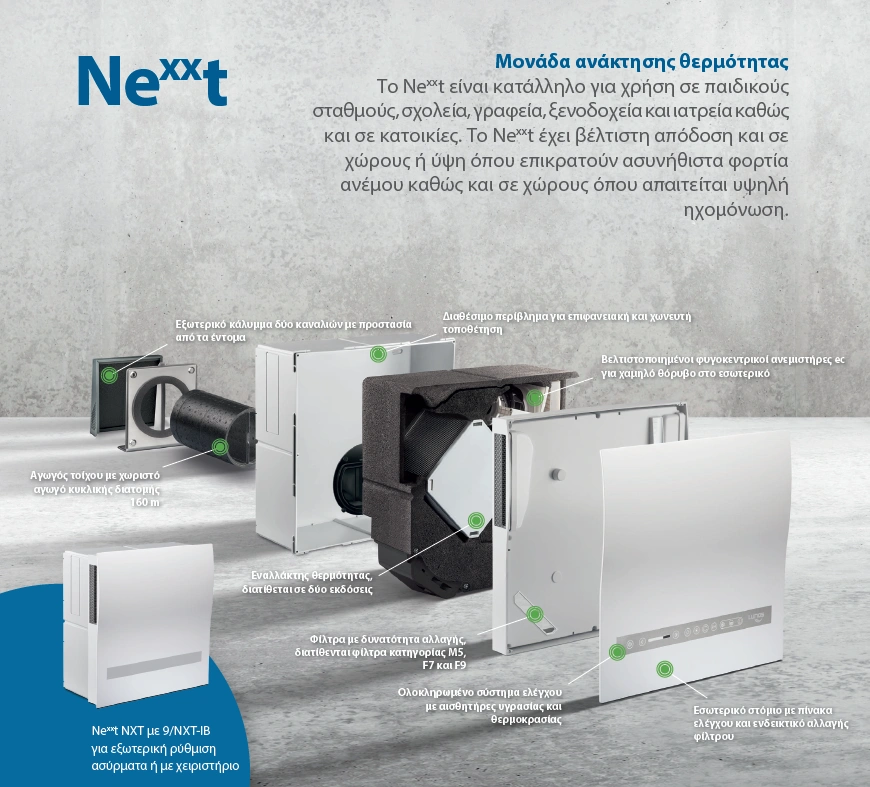 Το NExxT είναι μια μονάδα ανάκτησης θερμότητας που, λόγω της υψηλής ροής της, είναι ιδανική για χρήση σε νηπιαγωγεία, σχολεία, γραφεία, ξενοδοχεία, ιατρεία, αλλά και σε διαμερίσματα και σπίτια.