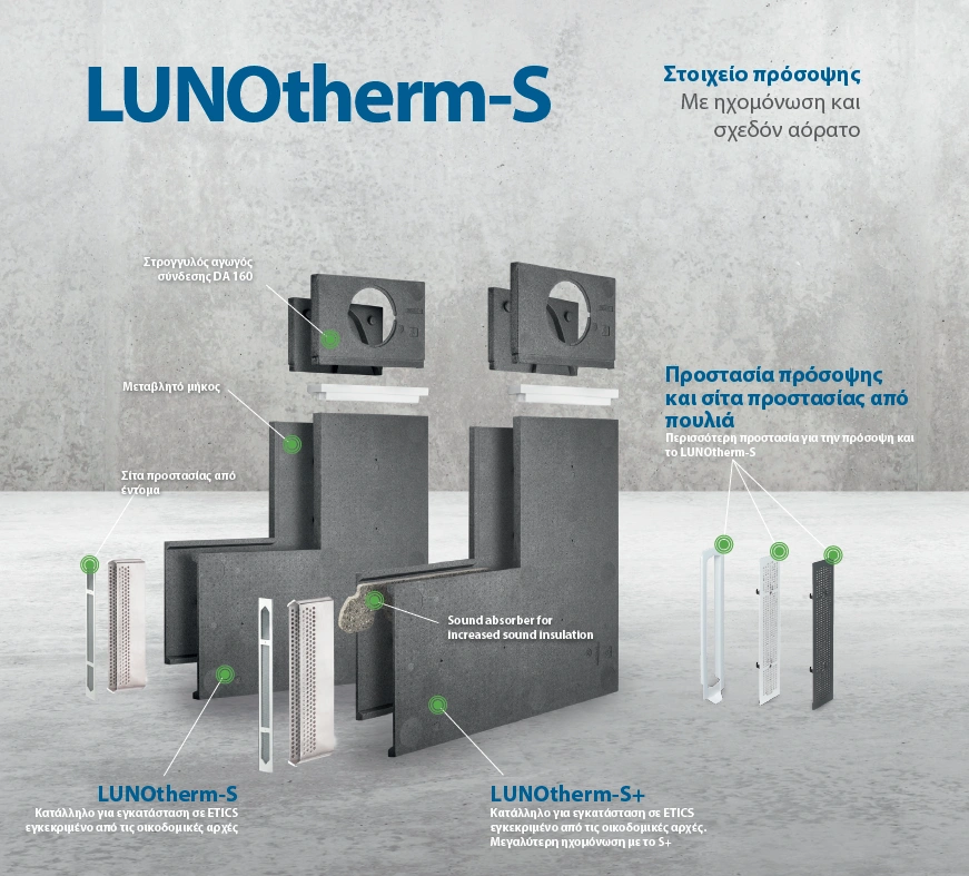 Το νέο στοιχείο πρόσοψης LUNOtherm-S έχει βελτιστοποιηθεί για σημαντικά υψηλότερη ηχομόνωση και είναι ακόμα πιο εύκολο στην τοποθέτηση του. Η εκτροπή του αέρα και συνεπώς και του ήχου κατά την ροή των 90 ° επιπλέον εξασφαλίζει τις υψηλές ηχομονωτικές ιδιότητες του LUNOtherm-S.